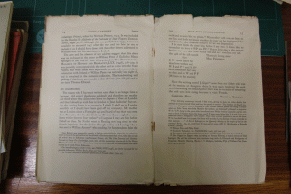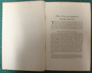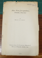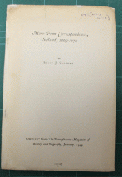 More Penn correspondence, Ireland, 1669-1670 by Henry J. Cadbury (an offprint from the Pennsylvania magazine of history and biography, Vol. 73, No. 1 January, 1949) is a typical example of one of the pamphlets I worked on. It had rusted, covered staples, paper tears throughout the pages, and some brittle areas of the paper that needed guarding.