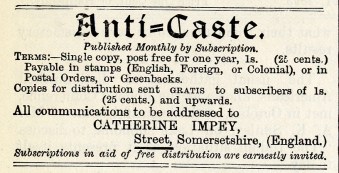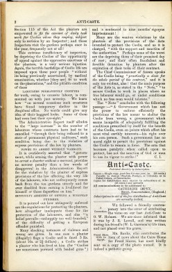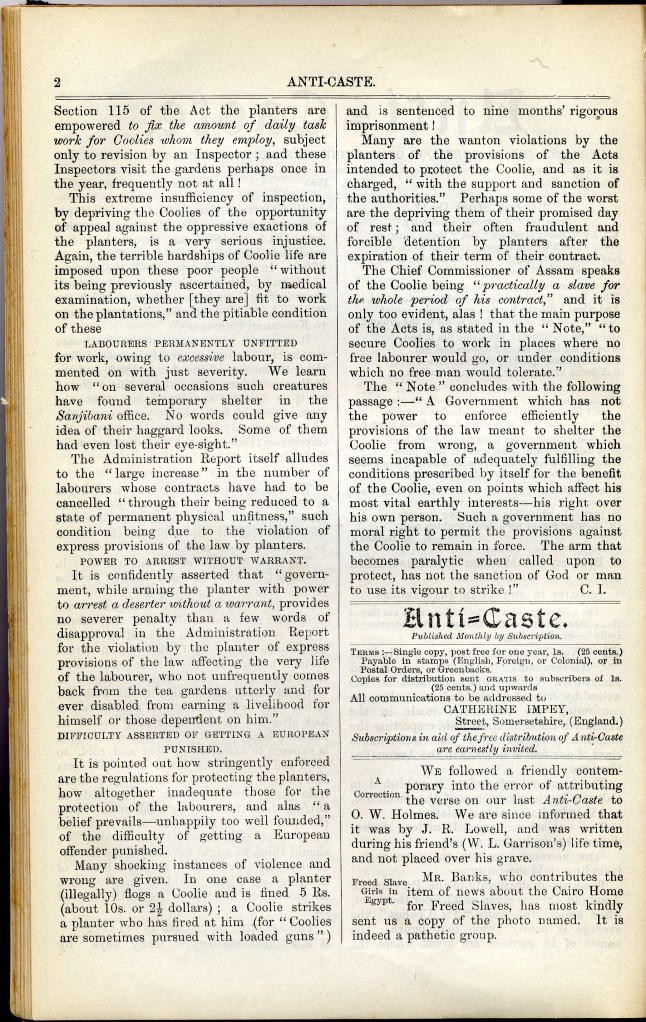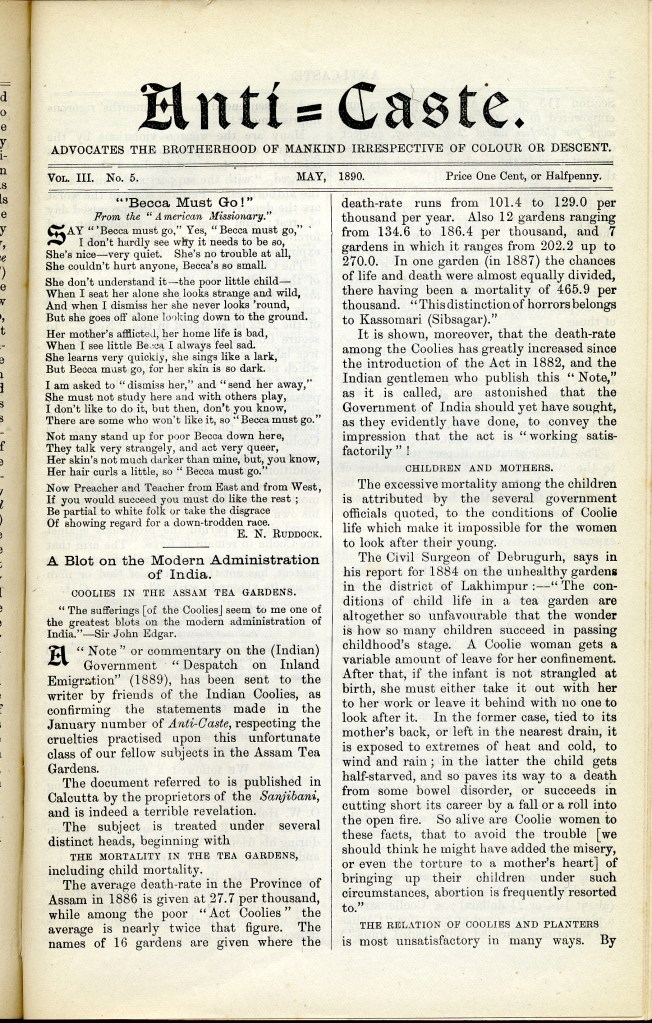 Anti-Caste also covered questions of racism within the British Empire, particularly India. An example of this is the May 1890 issue, where Impey denounced the conditions for workers on Assam tea estates.