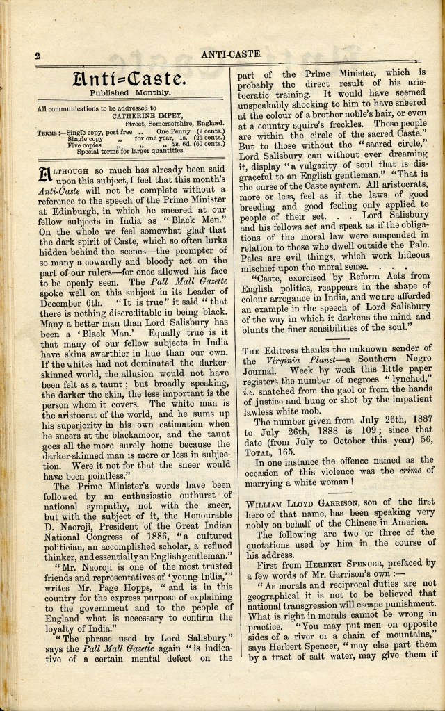 When a controversy arose over the British Prime Minister Lord Salisbury referring to Indians as “black men”, Impey used the January 1889 issue of Anti-Caste to condemn the racist philosophy underpinning British Imperialism.