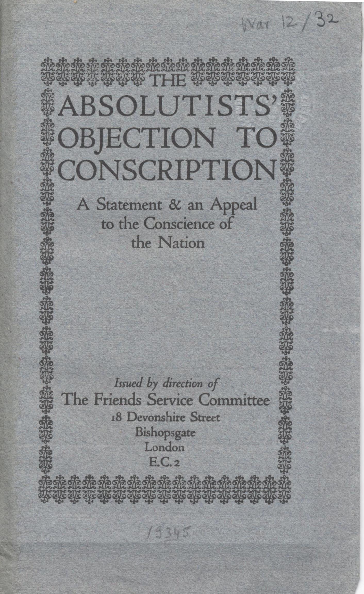 The absolutists’ objection to conscription: a statement & an appeal to the conscience of the nation (London: Friends Service Committee (1915-1920); Pelican Press, [1917])
