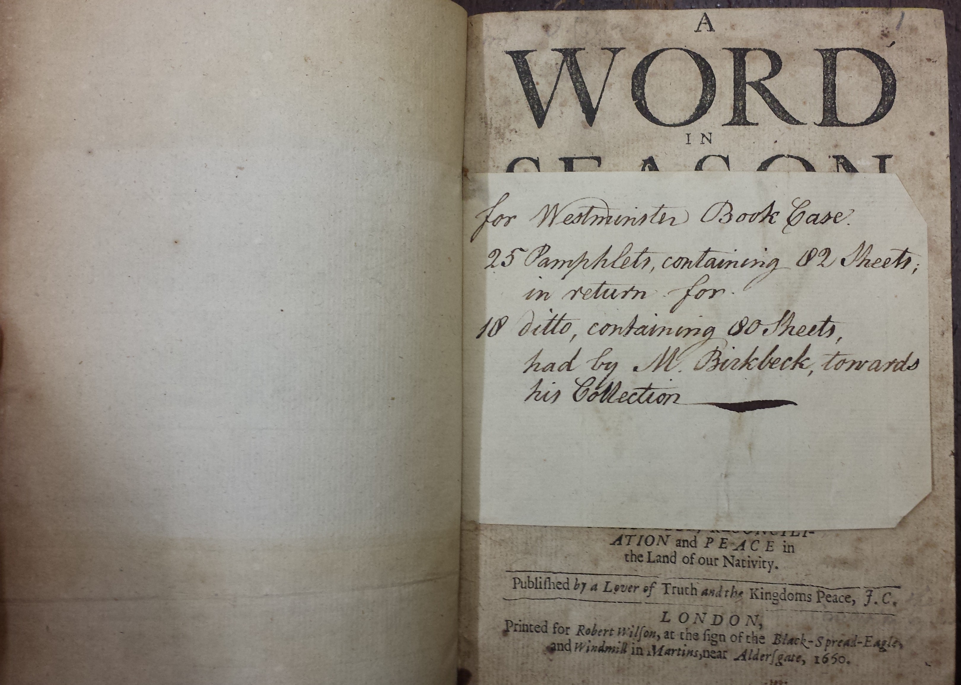 The answer lay in a handwritten note by the Quaker bibliographer Morris Birkbeck (1734-1816), whose spidery pencil annotations are unmistakably in evidence in so many Quaker collections. It seems that Birkbeck had spotted a volume he wanted in the Hawkins Collection and swapped it for one of his own (by agreement one hopes). His note punctiliously records the exchange in what sound like advantageous terms: “for Westminster book case. 25 Pamphlets containing 82 Sheets; in return for 18 ditto containing 80 sheets, had by M. Birkbeck, towards his Collection”. But it doesn’t say “Oh, and by the way, I threw in some death-bed sayings of Ann Leaver, recently published”, or, more importantly, what he got in return.