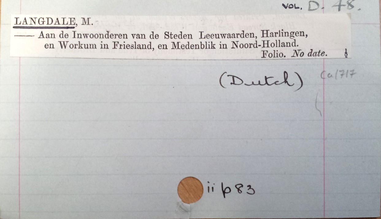 Langdale, Margaret. Aan de Inwoonderen van de Steden Leeuwaarden, Harlingen, en Workum in Friesland, en Medenblik in Noord-Holland. Published about 1717 (Library reference: Vol. D/48)