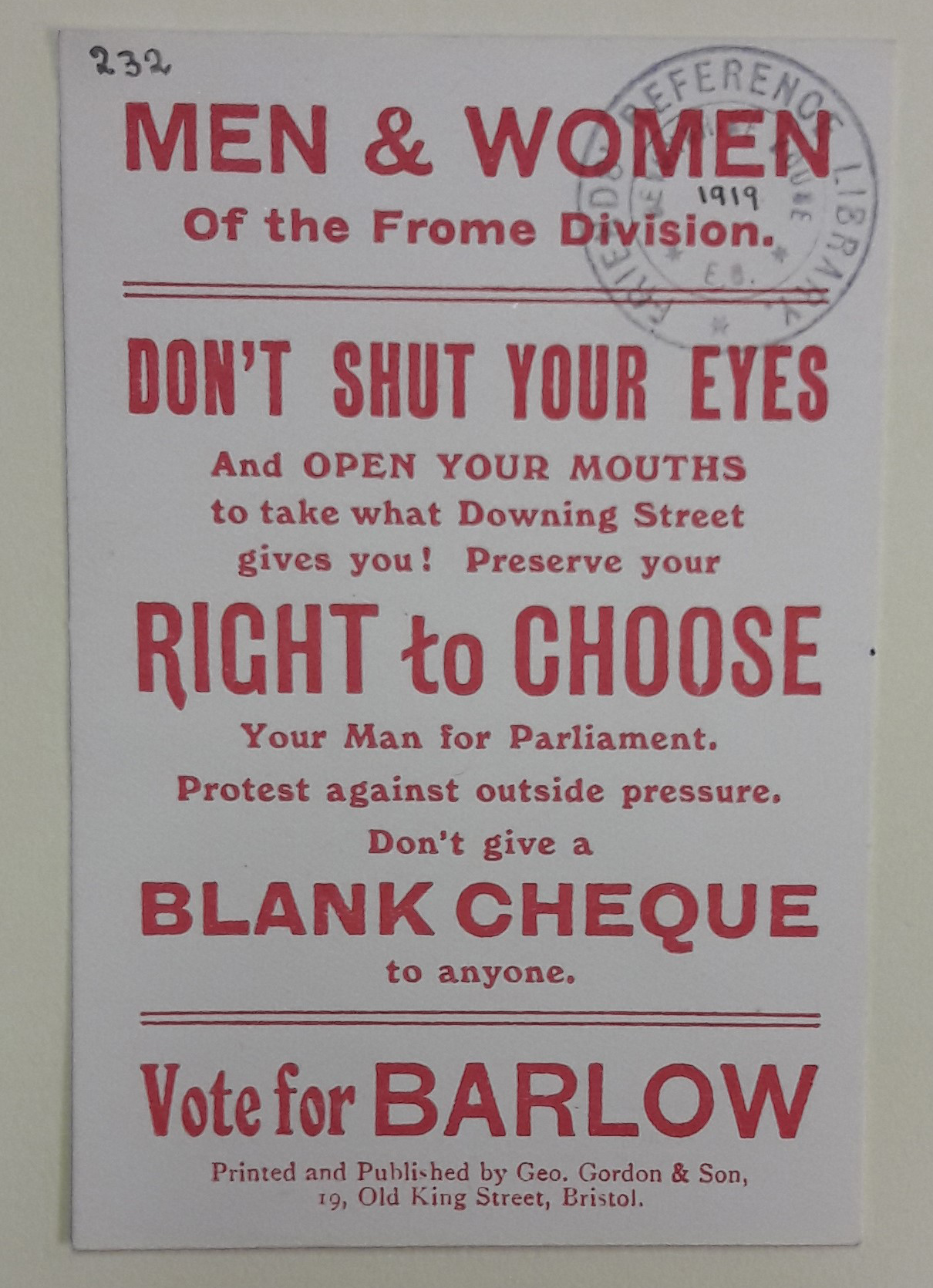 Election card, John E. Barlow, 1918 (Library ref: Box L 228/4)