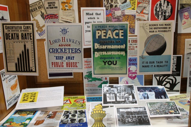 The Library’s latest reading room display focuses on our poster collection. The posters are a historic visual record of Quaker values. These values – or ‘testimonies’ – of peace, equality, simplicity and sustainability, and truth and integrity are the founding principles of Quakerism.