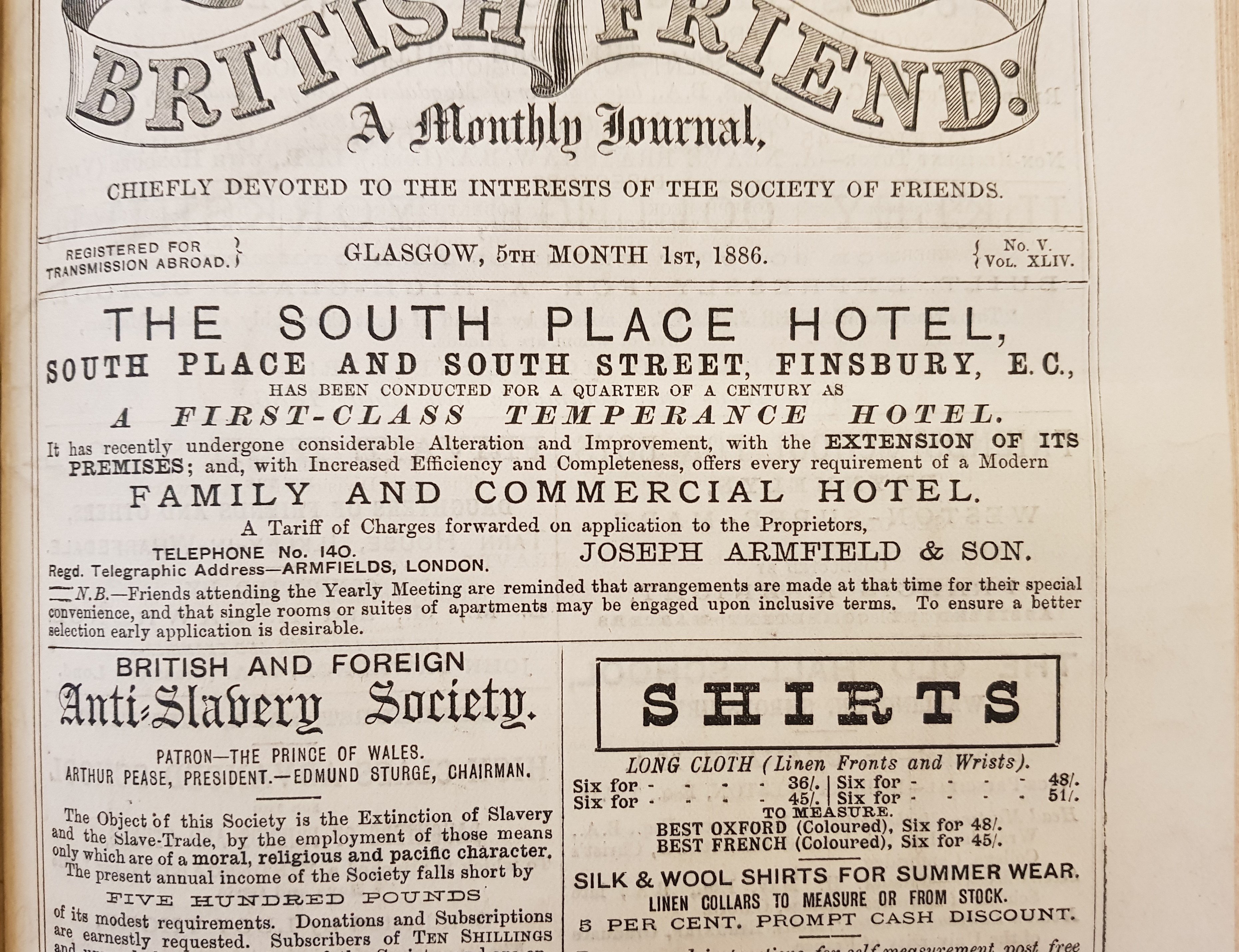 Advertisement for Armfield’s South Place Hotel in the British Friend (1 May 1886)