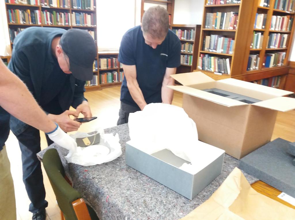 Constantine Fine Art transport team in the Library, packing the teacup and saucer for its move up north