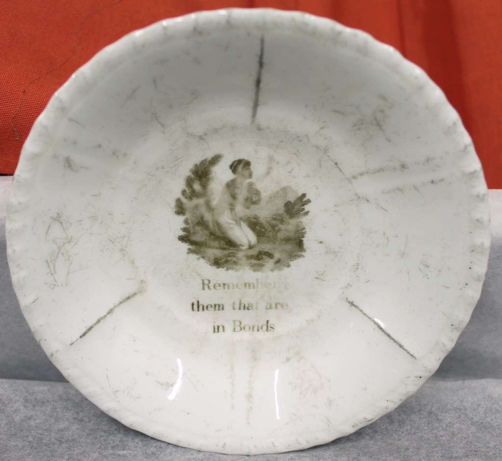 The teacup and saucer are made of bone china with a transfer print made circa 1820-30 from Staffordshire potteries. Many Quakers joined the campaign to boycott the products of enslavement, such as dyes, cotton and sugar.