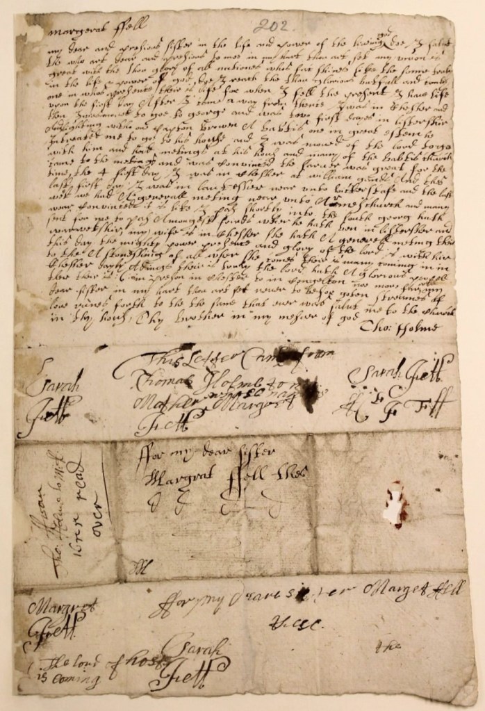 In 1652 George Fox visited Swarthmoor Hall, the home of Margaret and her husband, Judge Thomas Fell. He spoke at their parish church and made numerous converts to the fledgling Quaker movement, including Margaret herself. However, at this point she was the mother of 7 children, 3 of whom were under the age of 10, and her youngest daughter Rachel was born the following year. Thomas Fell was an assize judge who was frequently away from home travelling on his circuit. It was harder for Margaret to leave home and travel around preaching as others in the movement were doing. Instead, for most of the 1650s, she remained at Swarthmoor and became the hub of a Quaker information network that stretched across the world.
