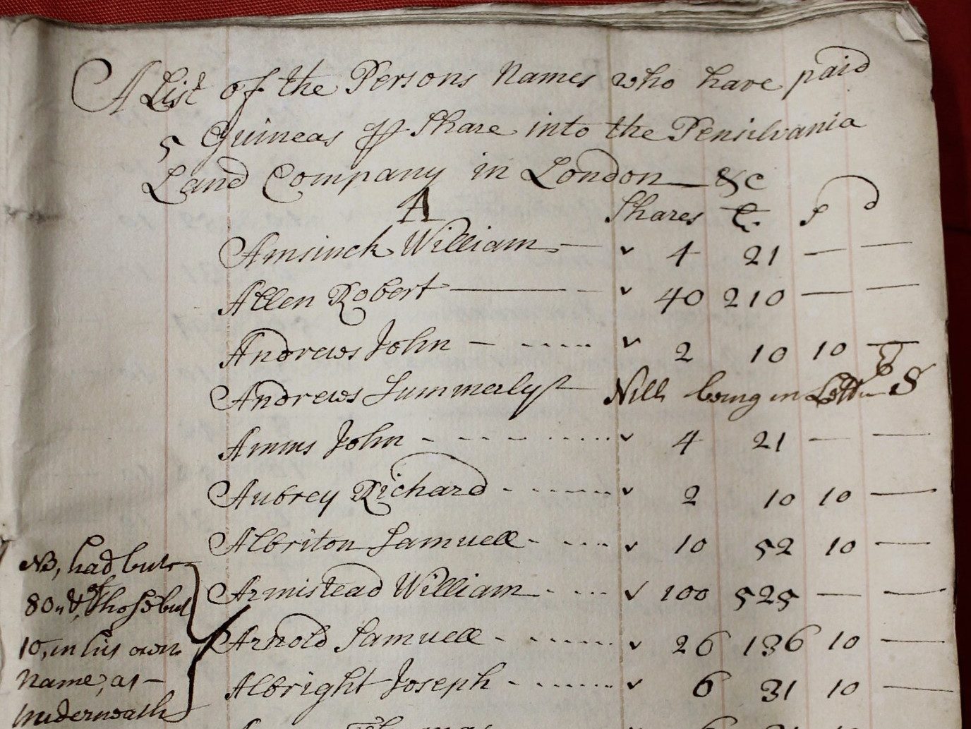 LSF Temp MSS 970 /8/1 – Detail from “a list of those who have paid 5 Guineas per share into the Pensilvania Land Company in London”. The surviving records of the Pennsylvania Land company are part of the Thomas Story papers here in the Library.