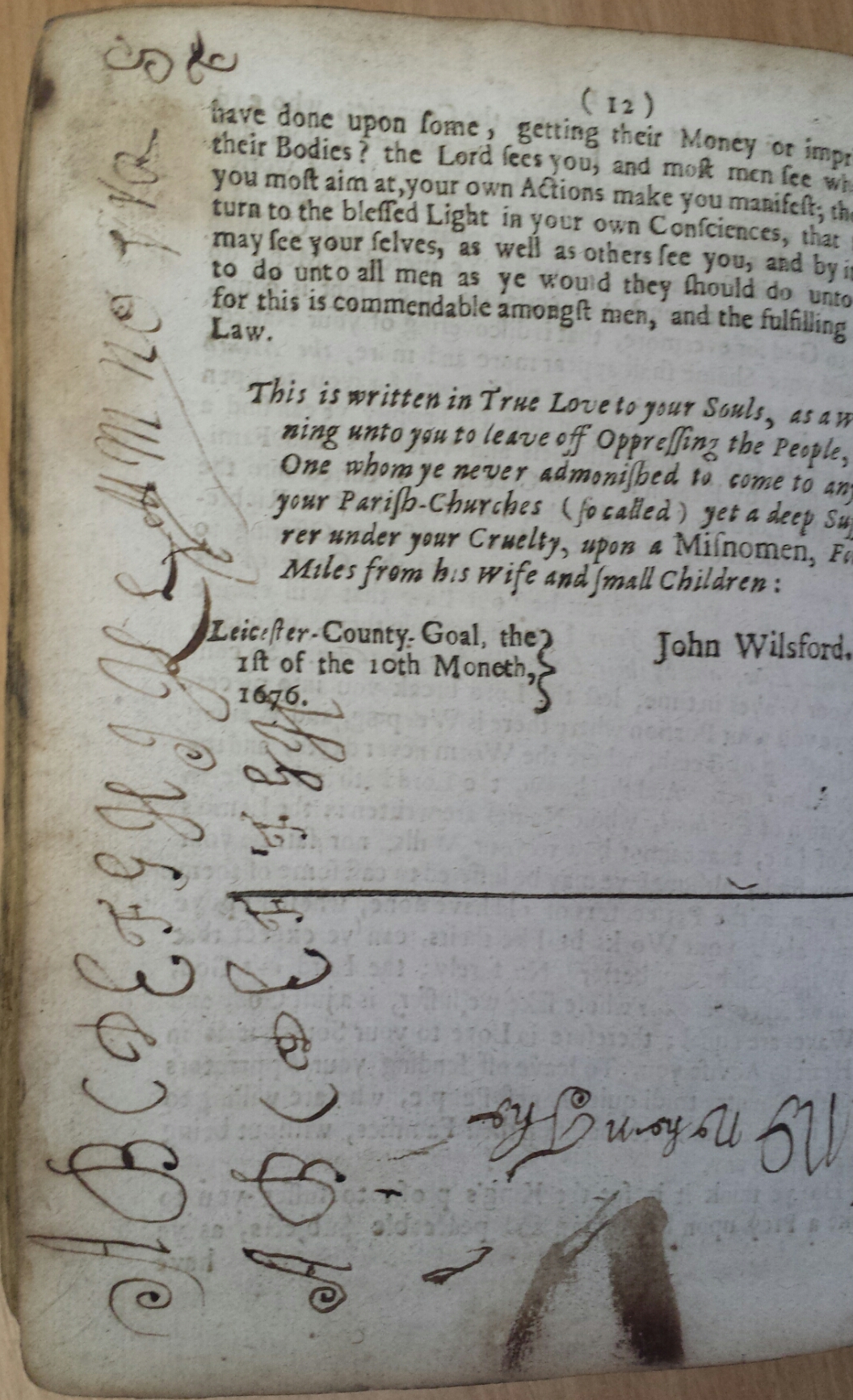 Marginal handwriting practice on final page of Willsford, A general testimony to the everlasting truth of God (1677) (Library reference: Hawkins Vol. 20/27)