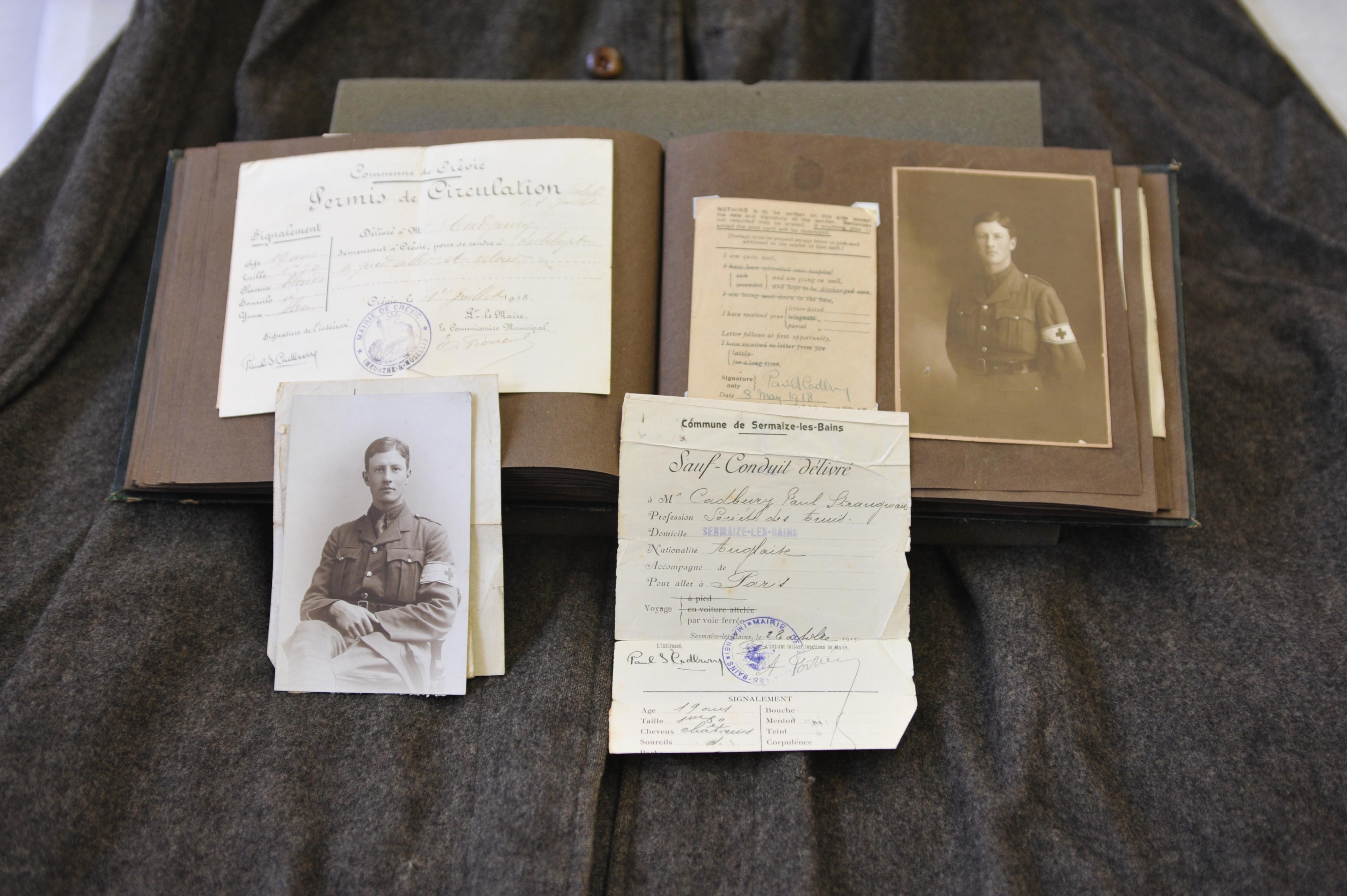 Cape worn by Paul S. Cadbury as part of Friends Ambulance Unit uniform in World War I and documents relating to his service. Part of the Paul S. Cadbury Papers, reference TEMP MSS 999.