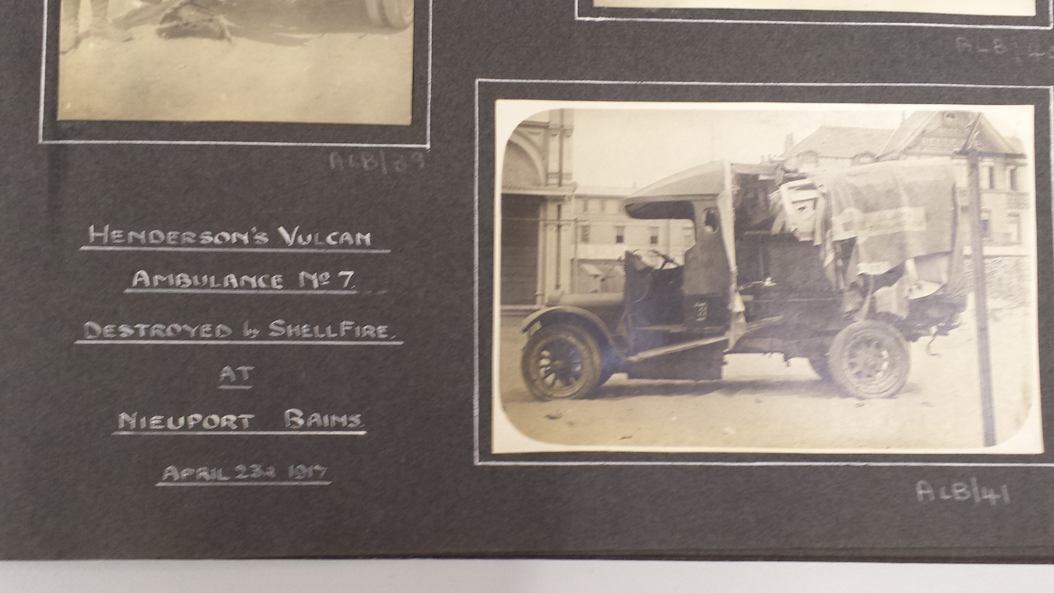 Henderson’s Vulcan Ambulance no. 7, destroyed by shellfire at Nieuport Bains, April 23rd 1917