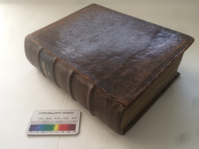 Tract Vol 51, with the treatment completed. Though the detail is now hidden by the new leather, the text is once again safe and accessible whilst the historical details on the spine remain in place and have been photographed and reported.