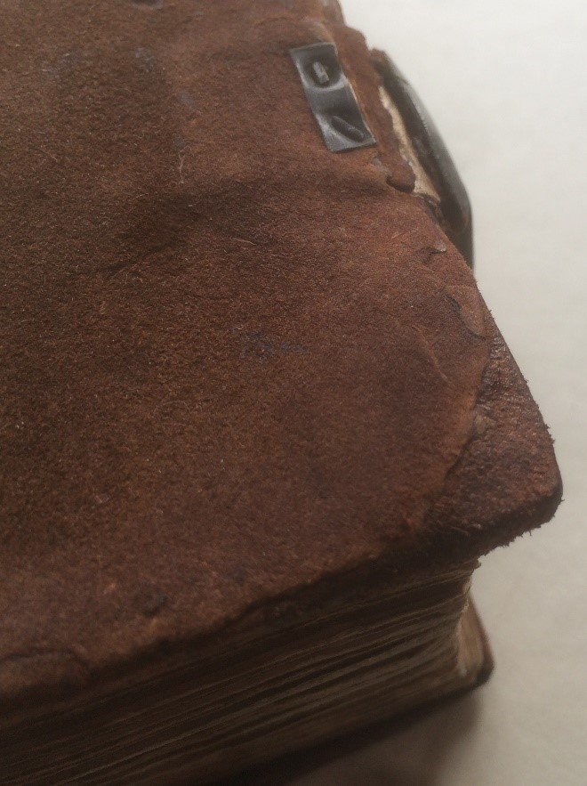 Tract Vol 85 – the missing corners of the board are first built up using layers of acid-free card before being covered with new dyed and shaved reverse calf leather