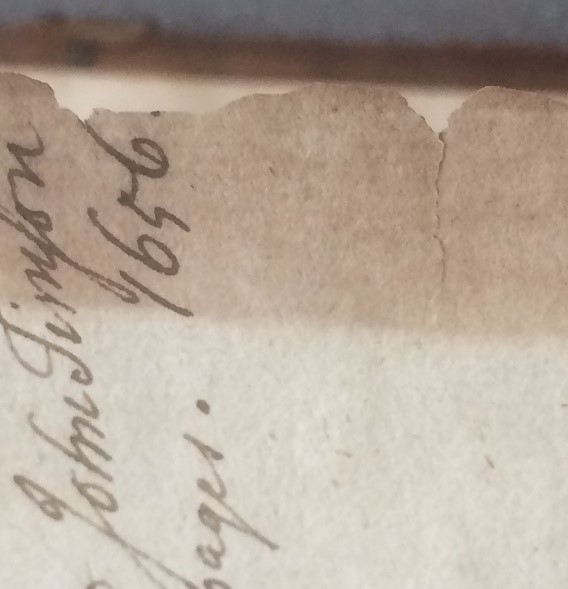 Tract Vol 85 – the flyleaf damage shows where acidic leather from the cover has discoloured the edge of the page, significantly weakened it, making liable to fracture and so putting the manuscript at risk notes at risk of loss.