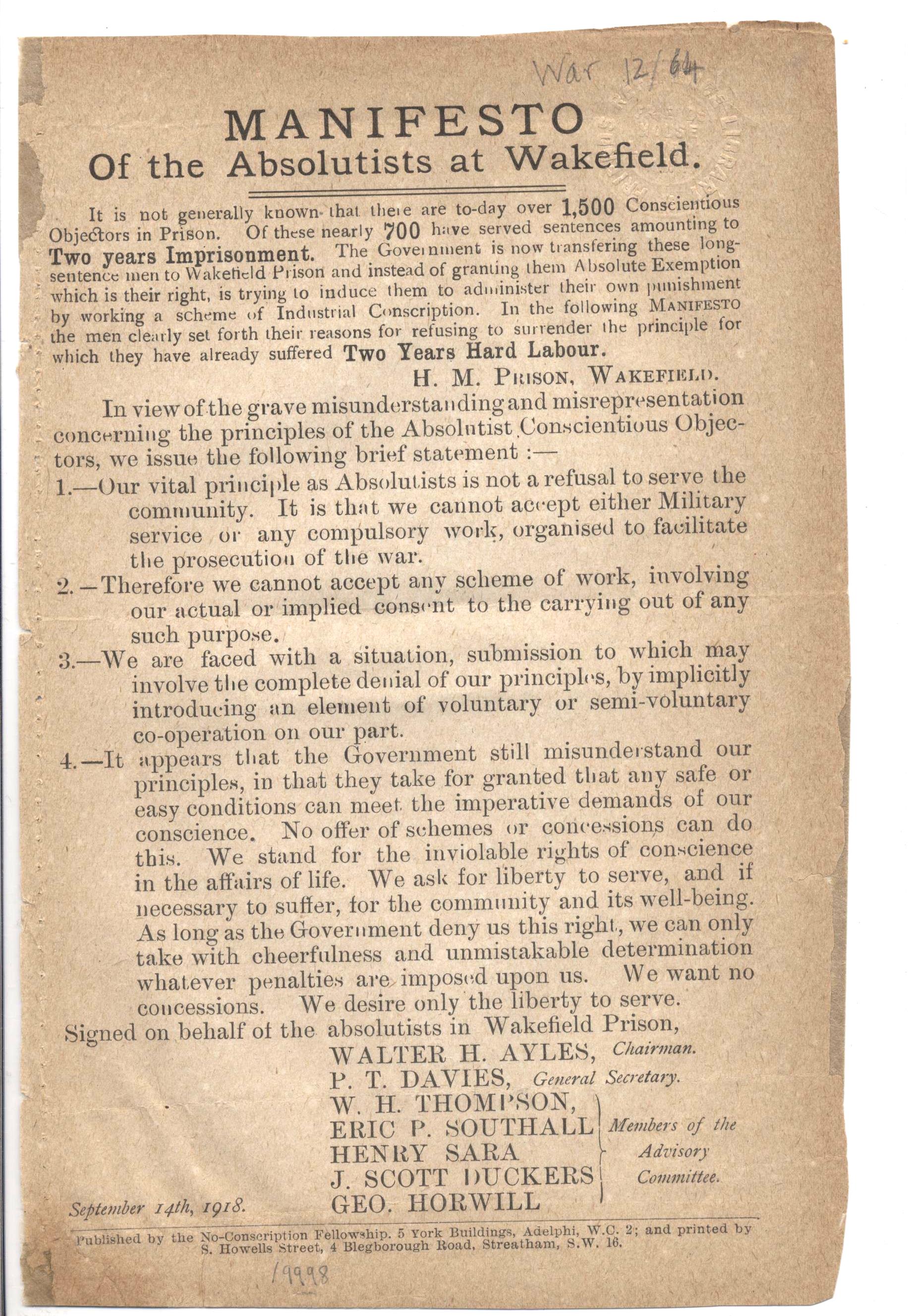 Manifesto of the absolutists at Wakefield (London: No-Conscription Fellowship, 1918)